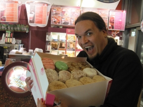 An der BJS am Alexanderplatz sondieren mein spieletipps-Kollege Philip Ulc und ich das Kursangebot im Hinblick auf Optionen für unsere Volontäre. Mit Erfolg. Bei der Gelegenheit kaufe ich direkt ein paar Schachteln Donuts. Rein dienstlich natürlich, denn ich nutze das Gebäck auch gleich für eine kleine Hommage an die Fernsehserie Dexter in der 25sten Uffruppe-Folge. Berlin ist eben immer eine Reise wert. Warum nur gibt es diese Läden nicht in Hessen?