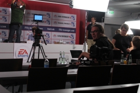 Thomas Tuchel, so heißt der Trainer der Fußballmannschaft Mainz 05. Mit ihm dreht im Pressekonferenzraum der frisch eröffneten Coface Arena ein Kamerateam ein Werbevideo zu Fußball Manager 12 - mit mir in einer kleinen Statistenrolle. Ein spannender Blick hinter die Kulissen der Filmprofis. Interessant zu sehen, wie die auf jedes Detail achten. Ein Aufkleber verwandelt etwa die Gerolsteiner-Wasserflaschen in die Fantasie-Marke „Blautaler“. Auf spieletipps habe ich Fotos des Drehtages veröffentlicht.